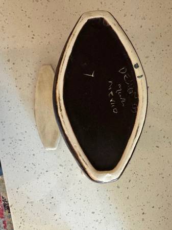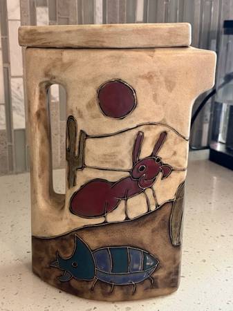 Beautiful design on one side is blue bird, flower and beetle; on the other side is desert with catus, ant, and beetle. Details: 40oz Approximate dimensions (l x w x h): 7" x 3.5" x 11 Hand Finished...