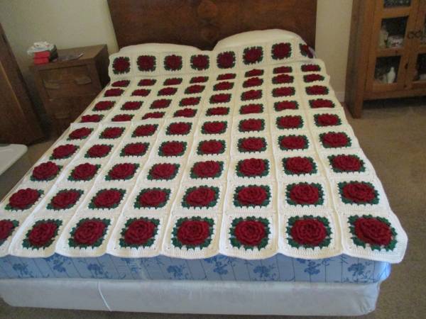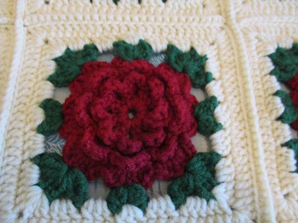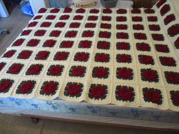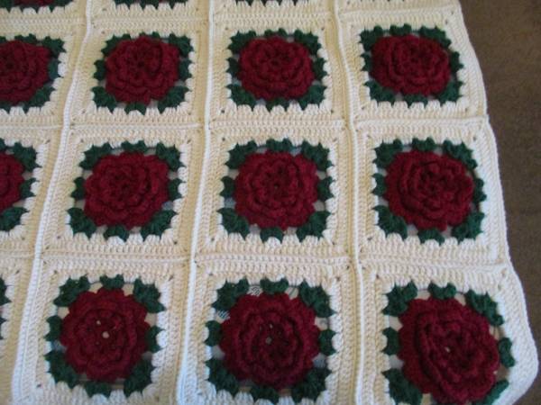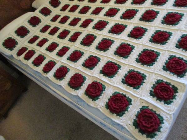 This is a Maroon 3-D Rose on White Background, Afghan Twin Bed Spread or Blanket.