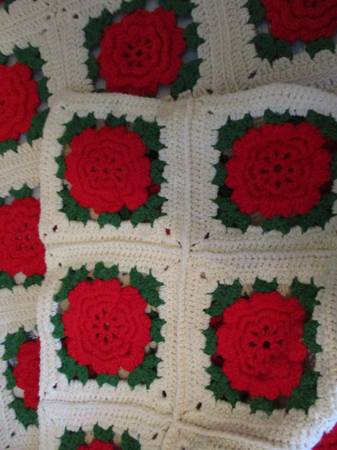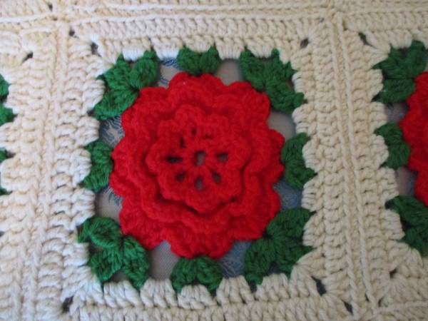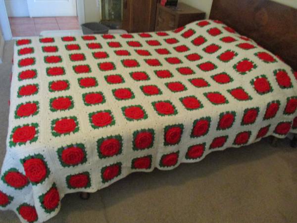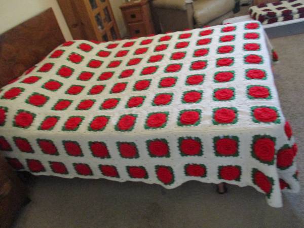 This is a Red 3-D Rose on White Afghan Bed Spread, Double Bed,.