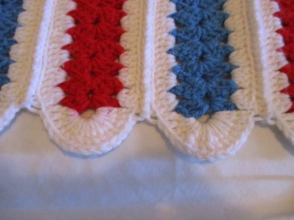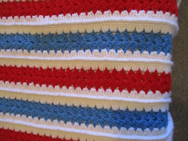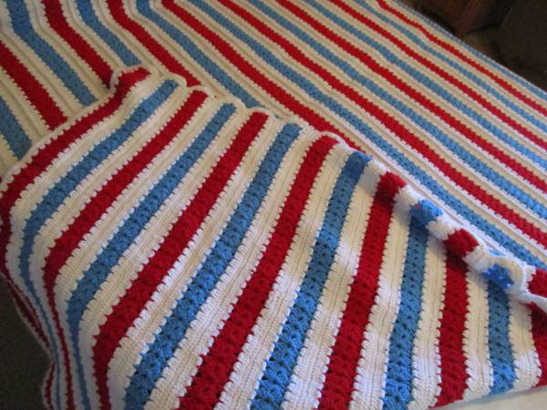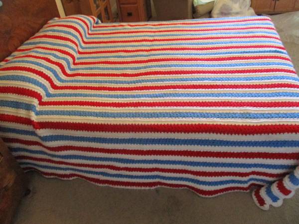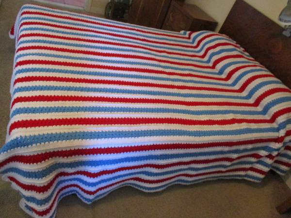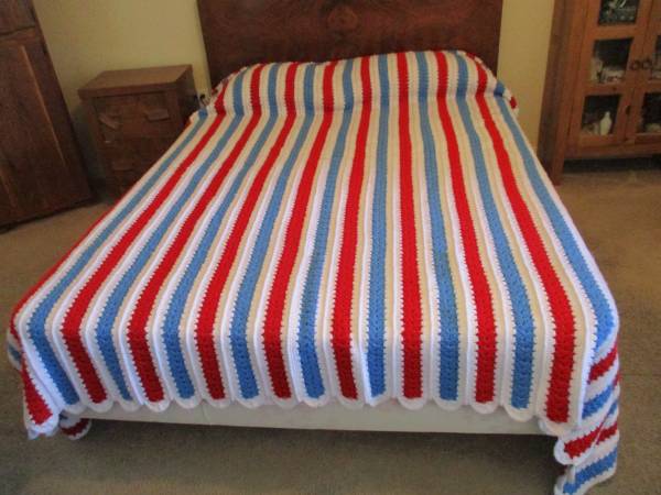This is a Red, White, & Blue Striped Afghan Bed Spread, Double Bed.