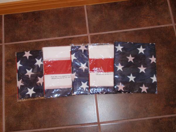These flags are brand new. They are all $5.00 each. There are many holidays when you can display our great American flag. So buy one or buy for your friends and other relatives. I will have them at the flea market this next Sunday, June 8th. I will be on row 2, table 23. I will have a flag displayed. They are 3' x 5'. You are welcome to come by my home to buy one or more than one. Cash only. Call 832-454-2two14 if interested in purchasing a brand new flag. CONSIDER THEM AVAILABLE UNTIL POST IS DELETED.