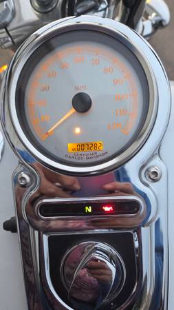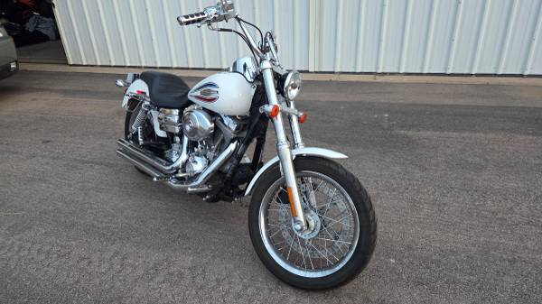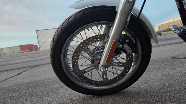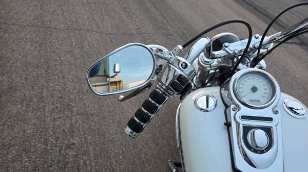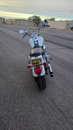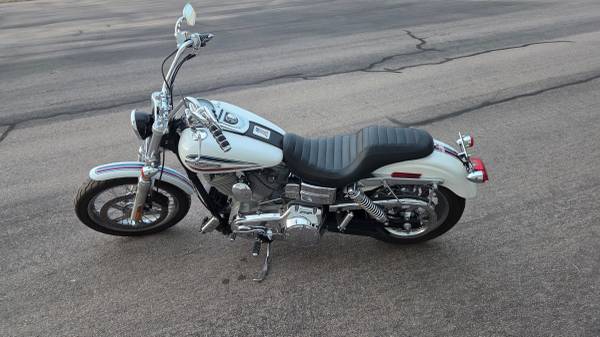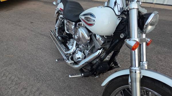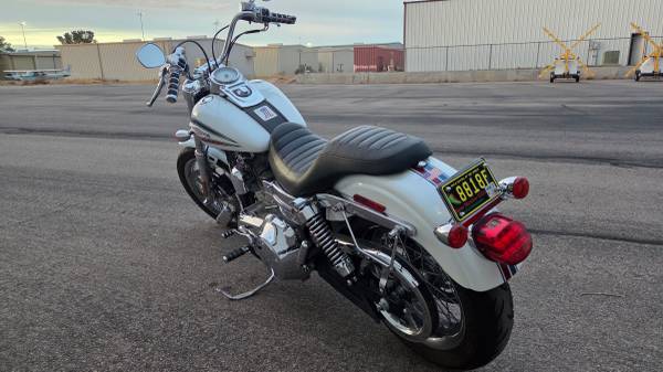 Absolutely beautiful anniversary Super Glide. Never down, stored indoors in the dry southwest. When new it listed for $4000 more than the standard super glide due to lots of extra chrome, special wheels, paint and badging, etc. Samson dual pipes with baffles sound awesome, deep and throaty but not too loud. Arlen Ness big front brake kit, Harley quick release touring windshield (not shown). Flush fuel caps with digital quantity display. And lots of extra chrome bits. Kuryakyn iso hand grips, pegs and highway pegs.