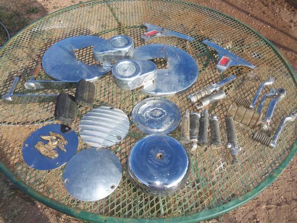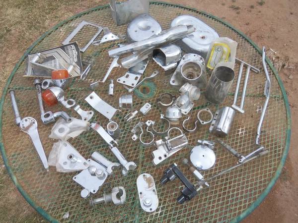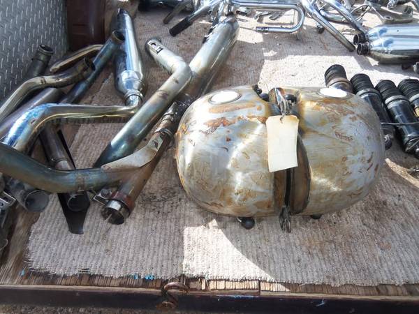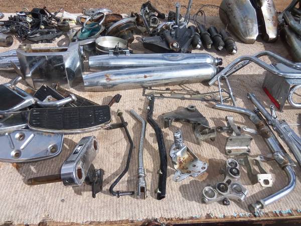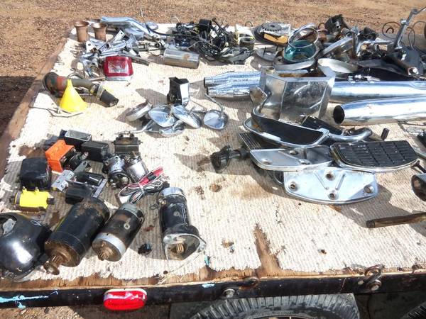 We picked up this stuff for a long song and a slow dance so we will dump it cheap. Looking at the pictures ... that equates to maybe $1.50 an item ! Wow .. better jump on it and quadruple your money. We rather sell it all one price. Not in pics is 3 other gas tanks and 2 rear fenders with attachments, rough but not dented. 6 motor cylinders, 4 cylinder heads. No early Harley parts no early Indian parts. Looks to be 60s - 80s. Chopper Hippie years. >>> Bring tubs, big boxes, full size pickup or trailer.