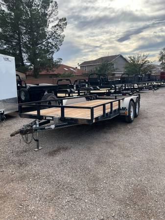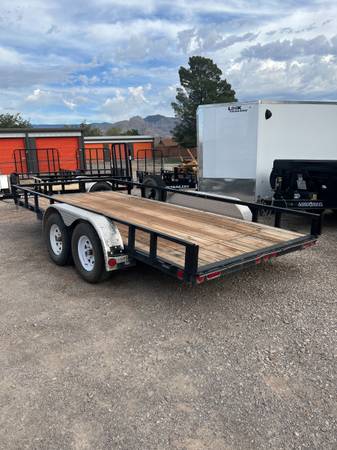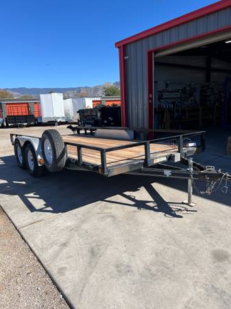 This PJ trailer is 16' long and 83inches wide. It is great for a UTV, water tank, and construction material. This trailer has a spare tire mounted and a set of rear slide in ramps.