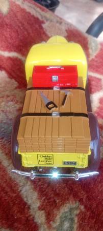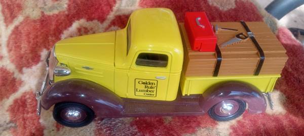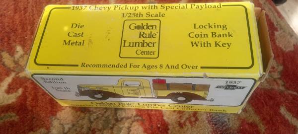 The product is a 1937 Chevy truck collectible bank, produced by Liberty Classics as part of their 2nd edition.'98 VINTAGE Made of die-cast material, this original piece is themed around vehicles and is a unique addition to any collection. This new in box item is a replica of a classic Chevy truck, featuring intricate details and perfect for fans of vintage vehicles. Made in China, this collectible bank with key is a must-have for any Chevy enthusiast.