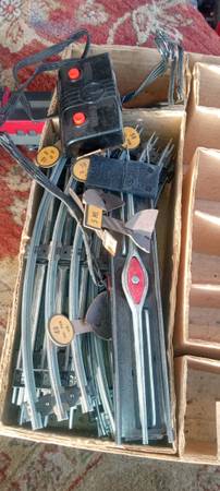 This vintage set is complemented by its original box, a testament to its authenticity and historical value. Whether for display or as the centerpiece of a vintage train collection, this Marx track set is a nostalgic nod to a bygone age of toy making. Its timeless appeal and durable material promise to keep this piece at the heart of your collection for years to come.