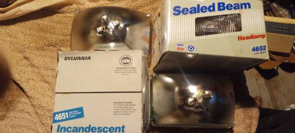 The product is a set of two pairs of Wagner & Sylvania 4651 Hi and 4652 Lo Beam Headlamps, designed for vehicles operating on 12 volts. These vintage headlight assemblies are manufactured in the United States and come with four bulbs included. The bulbs are of brand Wagner and have a voltage of 12 V. These front placement headlamps have a bulb shape code of 4651 4652, making them ideal for vintage vehicle restoration projects.