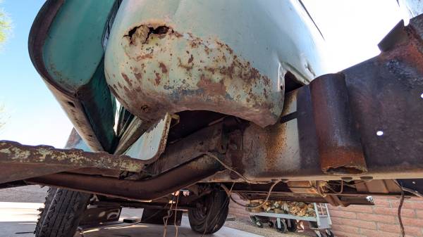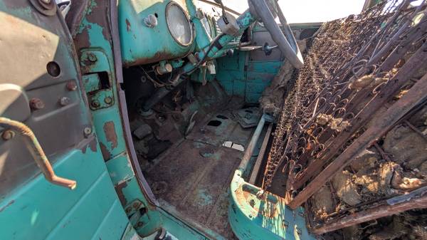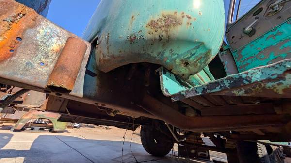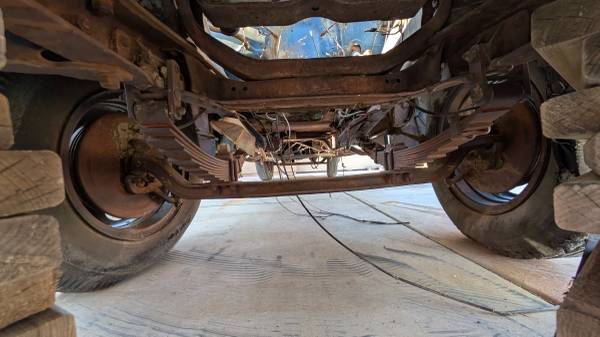 The frame has been cut right behind the cab. It's attached to another 6400 cab that I bought this for. I'm keeping that cab, the rest will go with this one for sale so it is a rolling frame. Other one has engine, transmission, and PTO transmission, hood, fenders, bumper, etc. which will be included in the sale.