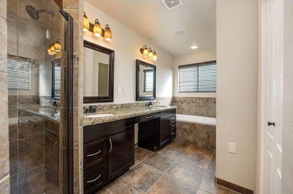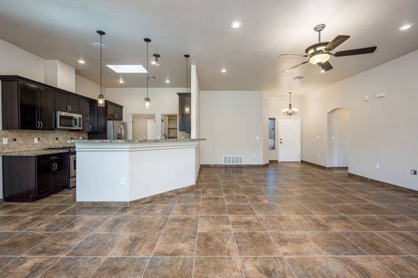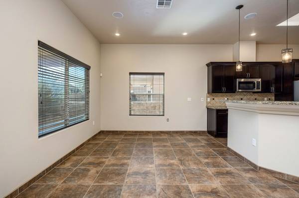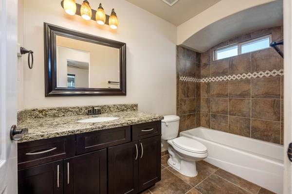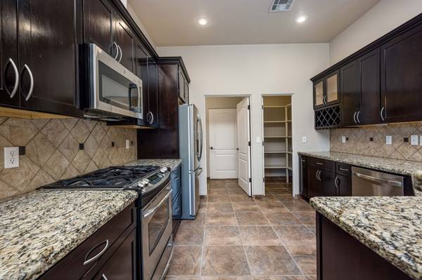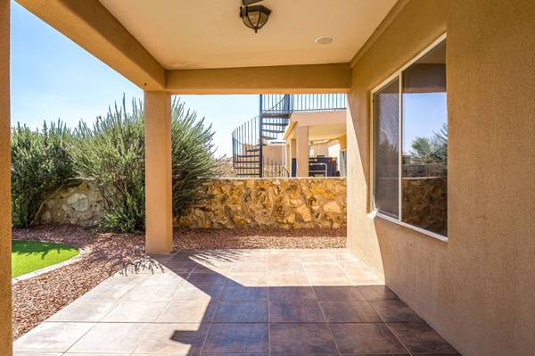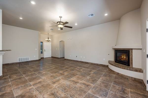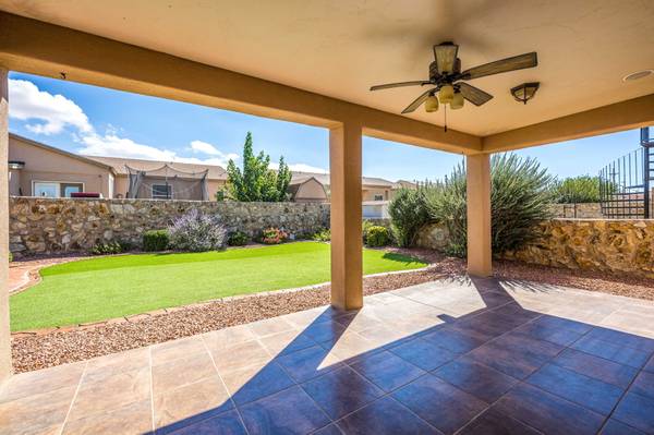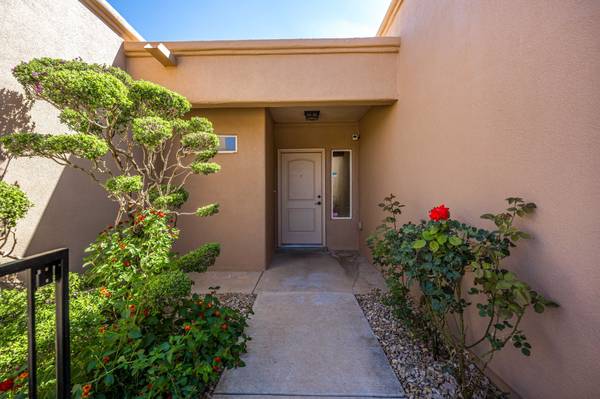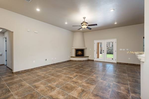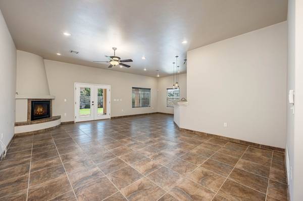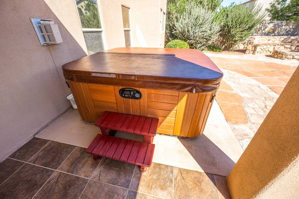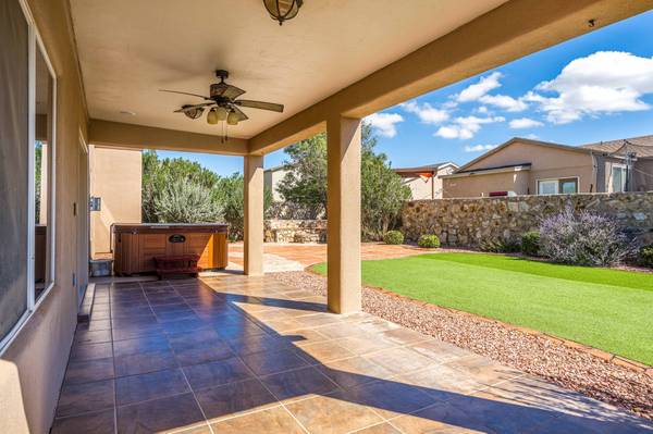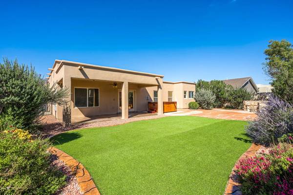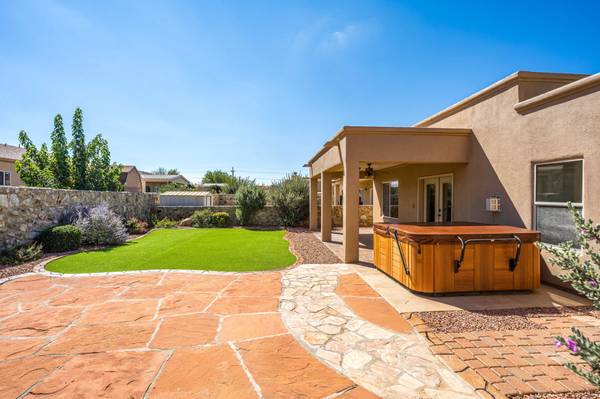 This beautiful Southwestern-style home welcomes you with an inviting courtyard and timeless design. Featuring 3 bedrooms, 2 baths, and 2-car garage.The open floor plan is enhanced with tile throughout. The spacious Great Room offers French doors and a cozy gas fireplace, while the Country Kitchen impresses with custom wood cabinets, granite counters, wine storage, a breakfast bar, and a pantry. The large Primary Suite includes a luxurious bath with double sinks, granite counters, a jetted tub, a stall shower, and generous walk-in closet. Two additional guest bedrooms also provide walk-in closets and share a well-appointed bath with granite counters. Outdoors, enjoy the backyard with artificial grass, a covered and tiled patio with a ceiling fan, a fire pit, and a relaxing hot tub, perfect for both comfort and entertaining. Additional highlights include a painted garage floor, freshly painted stucco with repaired parapets, tinted double-pane windows ,and a built-in speaker system with room controls. Some rooms staged. Move in ready.