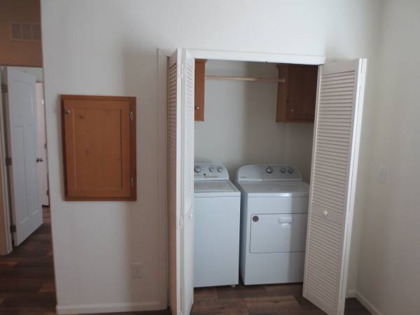 It has lots of cabinet space, especially in the kitchen. New washer and dryer only used a few times. Storage shed.