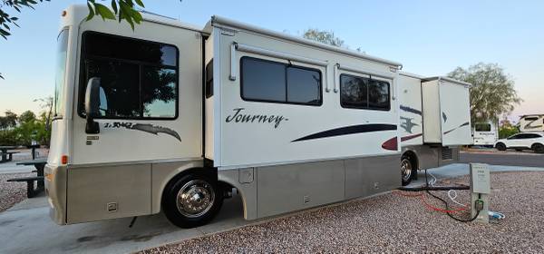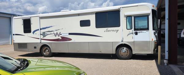 I have a 2002 Winnebago Journey 36C Diesel Pusher on a Freightliner Frame. New Roof with lifetime Warranty, New Roof Vents, New Digital Antenna. Basement A/C works great, has new computer board and control Board. New electric/generator power switch box. New 12Volt Refrigerator with 4 solar panels, Water heater newly repaired and works great on electric or gas. The Generator a 7.5kw Onan works great and well maintained with Oil Change and new Filter. The Engine, a Cummins 5.9 well maintained. New water pump, thermostat, Hoses, Fan belts, Radiator cleaned and flushed. Two electric fans installed on Radiator. All outside compartments have new Hydraulic lift cylinders. New really bright headlights, new step motor. Two new TVs. Washer/Dryer Combo. New cab fans. New Main Cab A/C. Tires in good condition. TPM Monitoring system for Motorhome and Car. Motorhome Brakes inspected with 75% remaining. New Air Brake Filter. New Shocks and New Steering Strut. New radio in dash. Well maintained. Oil change with new Filter. Trandsmission Oil change with new Filter. Comes complete with towing equipment. Motorhome has 99,200 Miles. Has two slide outs on driver's side. New main awning and new awnings on slide outs. Recently got buffed out to remove oxidation with a 3 year warranty. I have receipts and papers on repairs. New Queen Mattress. The Toad is a 2016 Ford Fiesta 3 cyl. Runs great. Ice cold A/C, Has 94,450 miles.