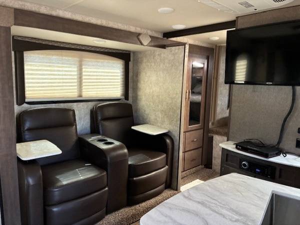 It has three slides, two recliners, a fold down couch that makes into a bed, a California King bed with underbed storage, a generator, two TV’s, a rear-view camera, a 60 gal water tank, two new batteries, two 30 pound propane tanks, lots of storage, a propane/110 Volt hot water heater. Outdoor shower, two solar panels, a furnace and air conditioner, an eight cubic foot fridge/freezer, dry bath , a heavy-duty fabric cover for the camper when not in use. All the comforts of a motor home with no insurance or registration fees, and you can use your truck when the camper is not on it!