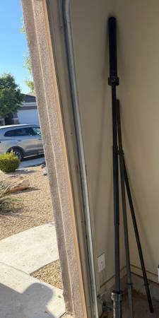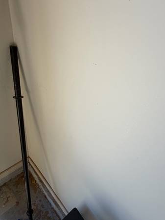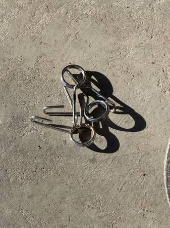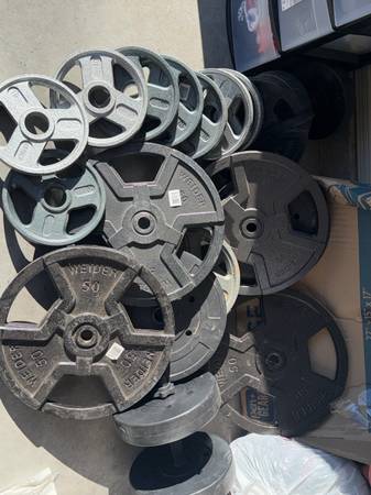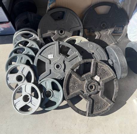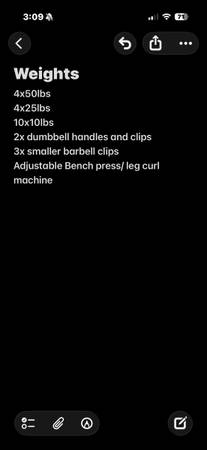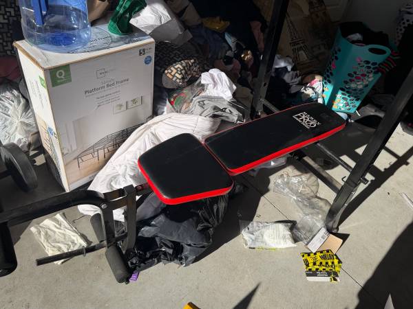 Adjustable bench press and leg press machine with various weights ranging from 10lb to 50lb and three barbells 10lb 25 lb 45lb sold as is all sales are final must come pick up