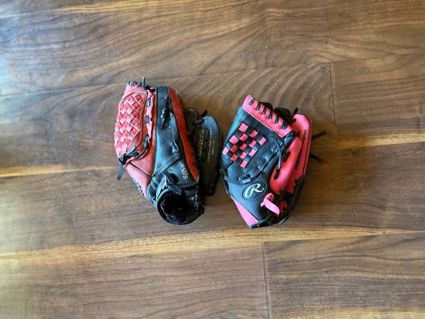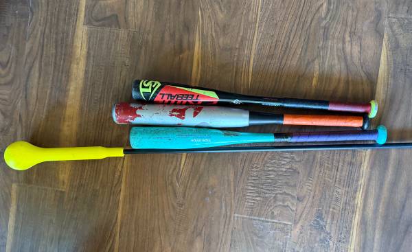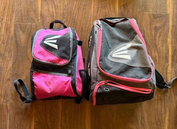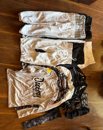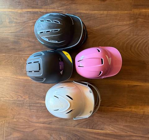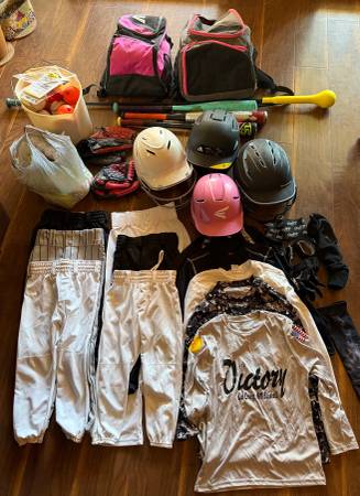 Kids baseball items $50 for all Pants, shirts, belt, gloves 2 baseball gloves 4 baseball helmets 2 backpacks 3 bats and swing trainer