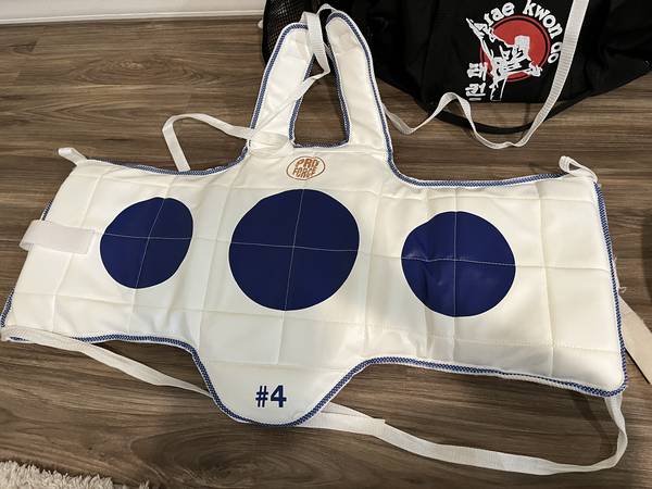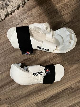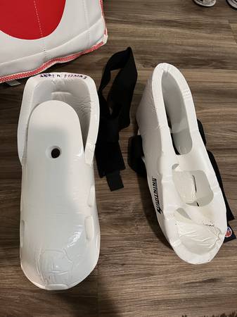 Used Lightning Pro Force Martial Arts Sparring Equipment: Breathable Bag, Headgear, Shin Guards, Foot Guards, Gloves, Body Guard, + Free Size 4 White Belt $95 or best offer.