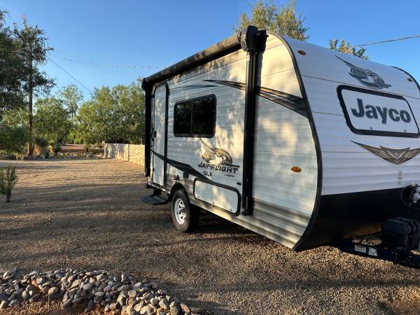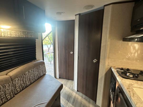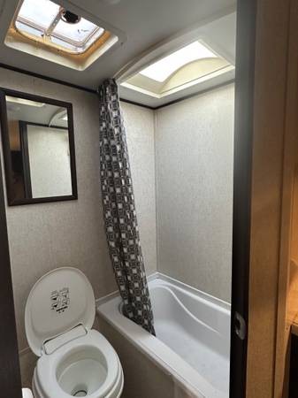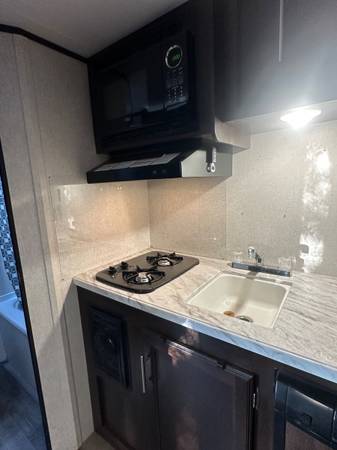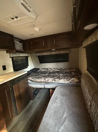 Great shape, used only 5 times. Sleeps 2 adults & 1 child. Everything works & includes all you need to enjoy hunting, fishing & camping. Light weight, easy to pull. Nice windows & blinds. Has 2 burner stove & microwave. Nice refrigerator with freezer. Enclosed bathroom with toilet & small shower/tub combo. Plenty of storage space for clothes & supplies.