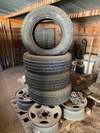 Four tires from F-150 Ford truck, includes four Rims & four Caps. 17 inch tires. Good tread. Stored in barn. **TEXT only. Available weekends.